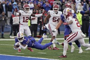 Oklahoma dropped four spots to No. 10, the top five teams held their places and Kansas and Kansas State both entered <a href="https://apnews.com/hub/ap-top-25-college-football-poll">The Associated Press college football poll</a> on Sunday.Georgia is No. 1 for the ...