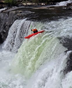 A kayaker paddles over the falls at Ohiopyle State Park during a Saturday afternoon trip down the Youghiogheny River in Fayette County. The kayaker and another paddler both safely made it to the other side of the falls and continued floating down the Yough.