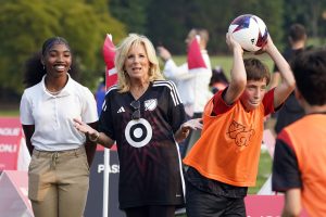 WASHINGTON (AP) — Kidz Bop rang out on the stereo as groups of sweaty children beamed with joy at the chance to kick around soccer balls with major league professionals at the White House Monday.Children donning jerseys of their favorite Major League Soccer teams joined first lady Jill Biden ...