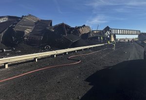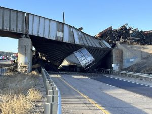 PUEBLO, Colo. (AP) — A train derailment and bridge collapse Sunday spewed coal and mangled train cars across a highway near Pueblo, Colorado, trapping a semi-truck driver beneath the wreckage, the Colorado State Patrol said.Efforts were underway to rescue the truck driver, state patrol ...