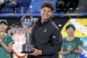 TOKYO (AP) — Ben Shelton won his maiden tour title, beating Aslan Karatsev 7-5, 6-1 at the Japan Open on Sunday.The 21-year-old American, who made his first tour semifinal appearance at the U.S. Open last month, continued his recent rich vein of form in Tokyo, making 18 winners and dominating ...