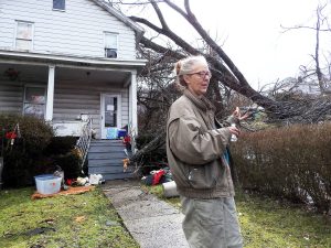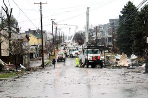 A tornado ripped through Uniontown Thursday evening, damaging dozens of homes and leaving streets littered with full roofs and walls, uprooted trees and downed utility poles.Two young children and their mother were trapped in a trailer in the area of Reppert Boulevard for about 20 minutes ...