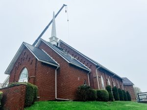So members of the congregation didn’t mind a bit of rain on Thursday morning, when a steeple was placed atop the church in Buffalo Township, off state Route 40.